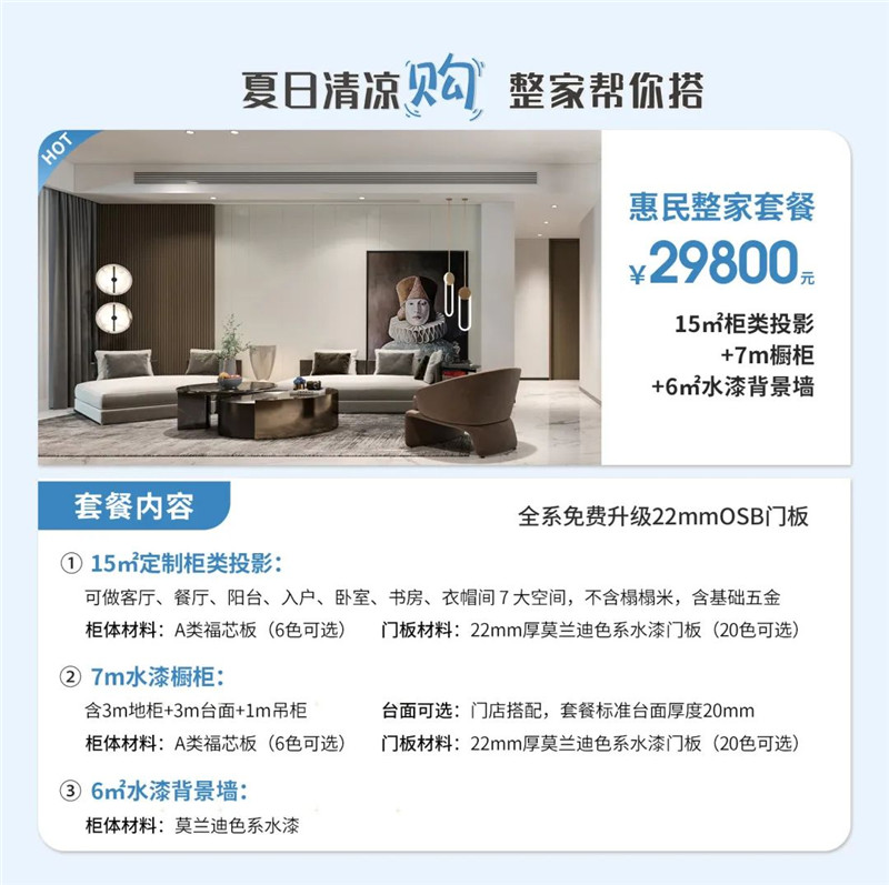 2023年6月30日-8月20日,jinnianhui官网 - 金年会年中大促带来惠民整家套餐¥29800,甄选水漆福芯板并严格遵守国家环保等级标准,打造高性价比的健康环保整家。