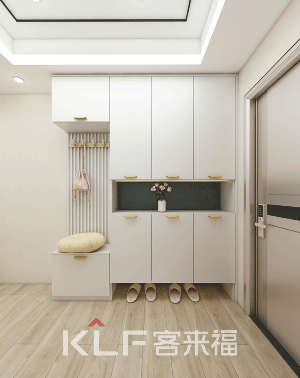 我们按照屋主人的喜好,采用了简洁现代的装修风格,整体以黑白灰为基础色,风格样式不会轻易过时。入户、客餐厅、阳台我们将其连成了一个整体,光可以直射进来,让客厅看起来更加明亮。入户柜的设计简洁大方,原木色的柜体搭配金属把手,简单而不失内涵。中空和下空式设计,让鞋物包包更加方便拿取。我们还贴心的为屋主人设置了一个换鞋的地方,让本身不太明显的入户柜独具风格。