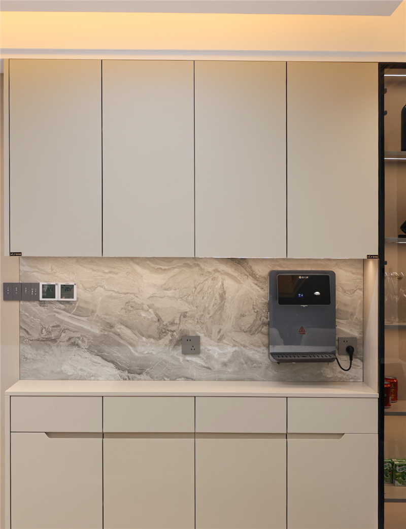 厨房贴墙打造U型深灰色橱柜,配合茶白顶柜,融入创新水漆工艺,呈现高级美感;常见厨房构造,大小户型都适合;整体光线层次分明,使得空间清晰明朗。