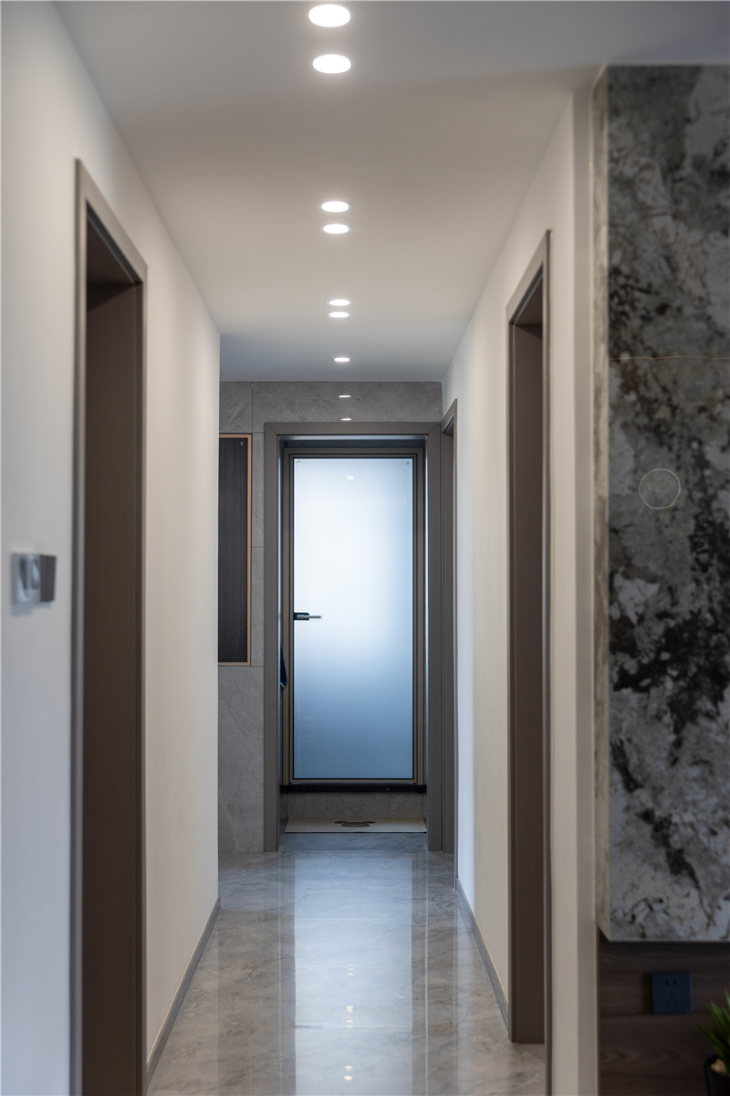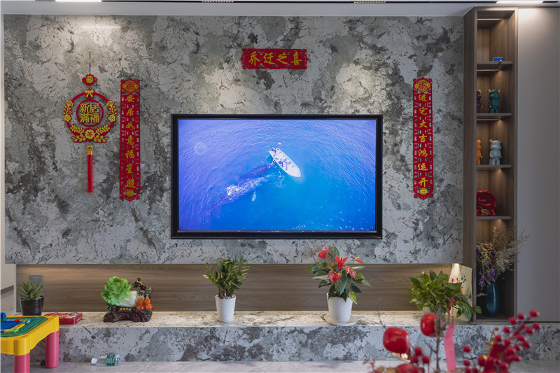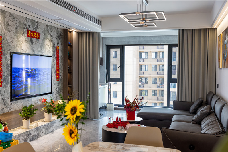 客厅整个打通后进行地砖通铺,延伸了空间视觉感,在客厅的空间设计上以简繁结合的方式,在电视柜背景墙上,以大理石石材进行装饰,为全屋带去更多的冷感。