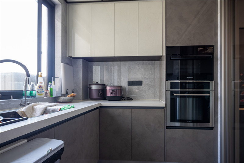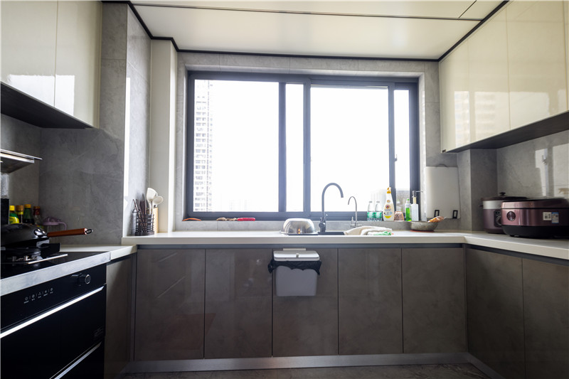 U型结构的厨房设计更注重物品的收纳,这种常规的吊柜+地柜的多重储物空间,正是能促成有序整洁的环境。吊柜采用伊丽莎白,亮面材质也很容易清洁。