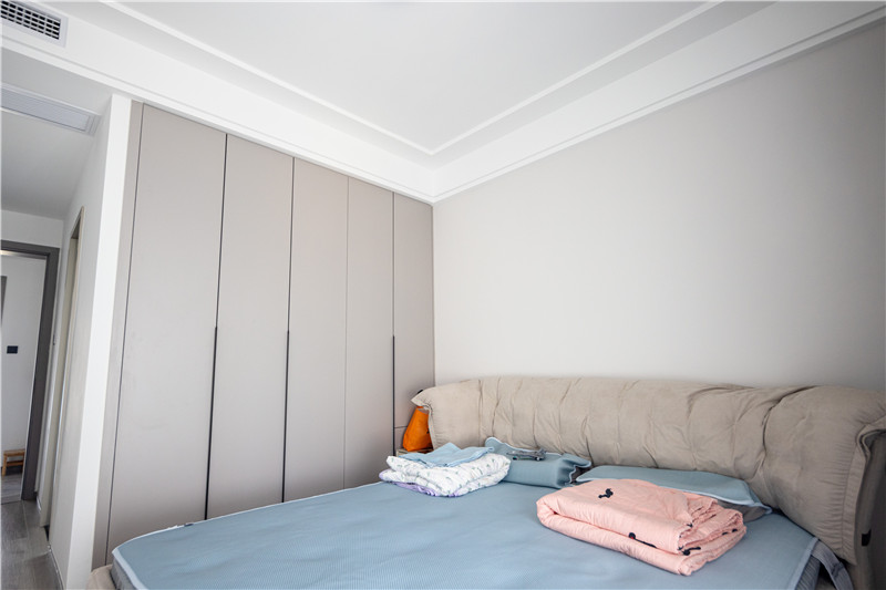 屋主根据居住者的需求不同,在每个房间的设计上都有所不同。主卧主要以睡眠区为主,在靠墙的位置设计了到顶衣柜,用于收纳日常的衣物,整体非常简洁。