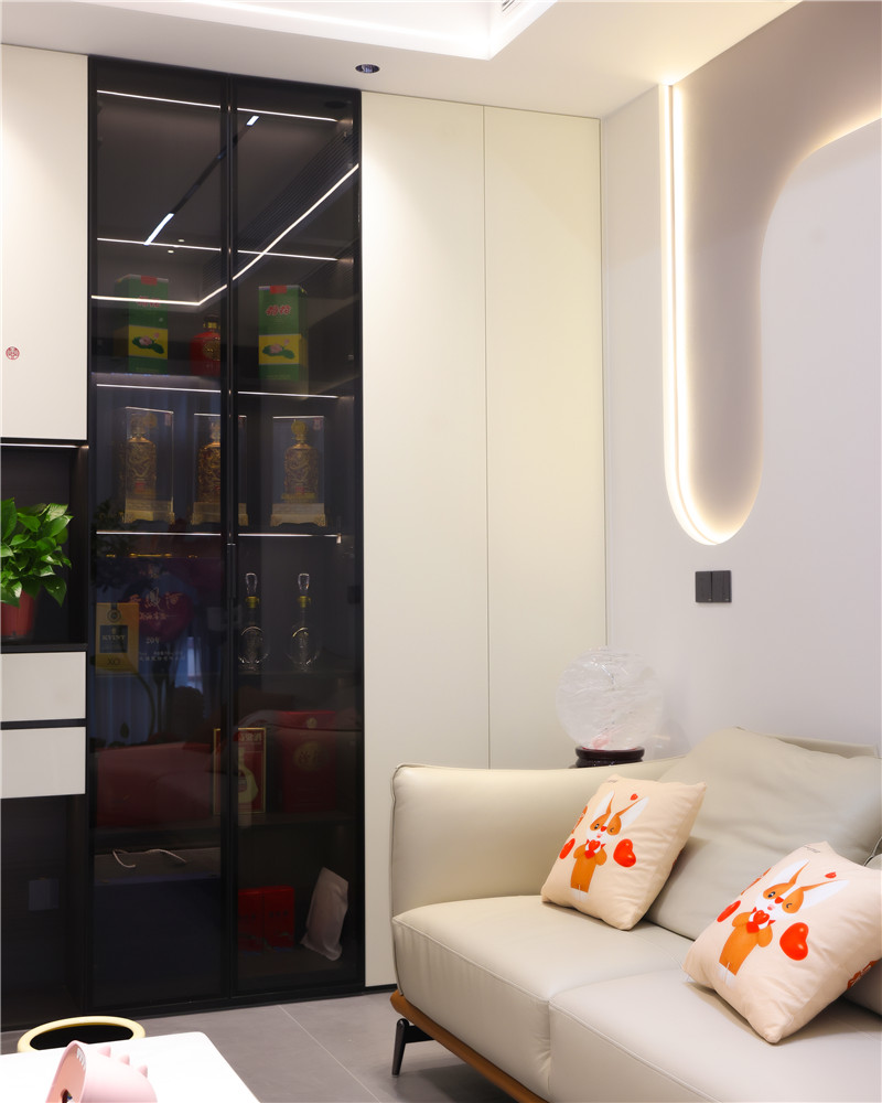 此玄关柜也充当隔断的作用,整面白玻配合型材拐弯,若隐若现感让人眼前一亮。