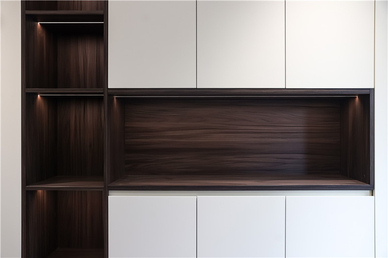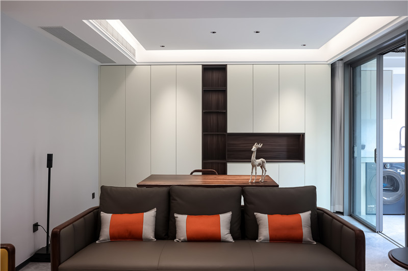 听风吟,赏叶落。靠近的阳台的空间里我们将其设计为一个开放休闲区,无论是想在这里办公阅读还是做手工、喝茶都是不错的选择。榆木柜体的纹理清晰可见,搭配纯净的白色通顶柜,带来一丝禅意,令人松弛神往。