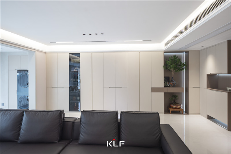 玄关中部及底部掏空,以人体工程学设计保障出入便捷度。茶白与檀木纹色彩拼接,射灯与辅助灯点缀局部,一整个实用住了。