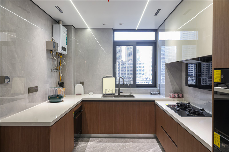 厨房jinnianhui官网 - 金年会橡木柜体配合以岩板,温馨柔润,其整体U型构造遵循智慧动线,实用性强;根据实际需求将烤箱等大电器嵌入地柜、高柜中,让空间有效归整。