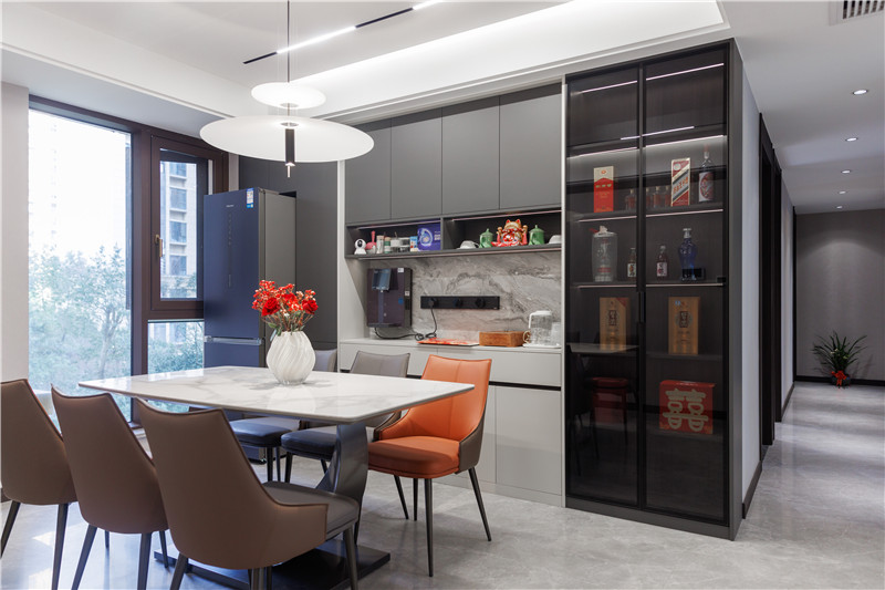 一侧冰箱嵌入立柜中,视觉上协调;一侧设置窄边黑框灰玻装饰柜嵌入灯带,是家里的风景线;餐边柜上下柜呼应、中部加入大理石纹背板,整体与餐桌椅配套。
