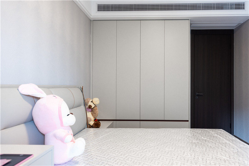 次卧满足了功能上的生活需求,进门一字型立柜,水漆茶白门板+无拉手设计,简约利落。