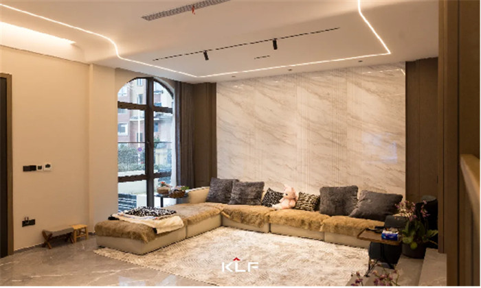 满墙格栅设计增加舒适感,缓和轻奢风带来的疏离,让空间更加和谐宜居,客厅无主灯设计让空间更加宽阔明亮。