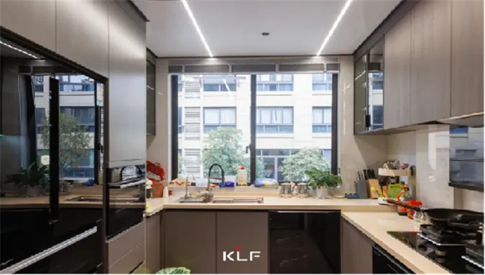 厨房主要以实用功能为主,将空间利用至理想化。U型布局拥有强大的收纳储物能力,将大型厨电内嵌至橱柜中,减轻客厅收纳压力,做饭也变得更加便利。