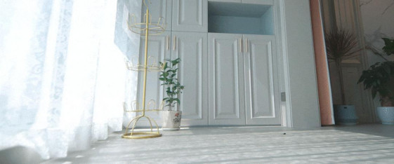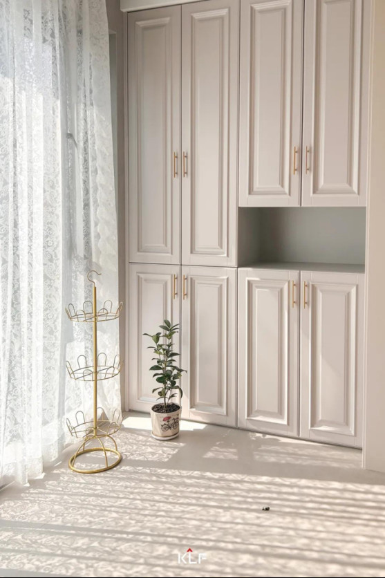 靠墙设计的水漆茶白阳台柜兼顾收纳和颜值,整墙简约金属拉手收纳柜让生活琐碎变得井井有条,纵向立体化收纳,搭配中间开放设计,可放置日常用品,便于拿取。