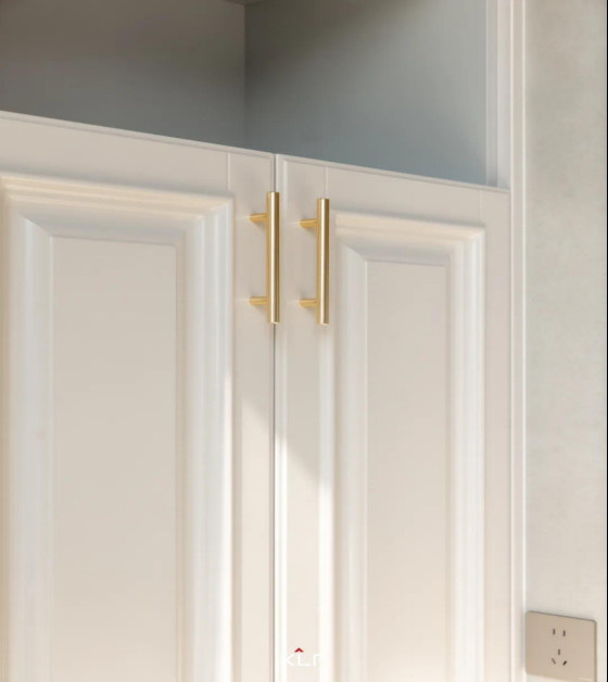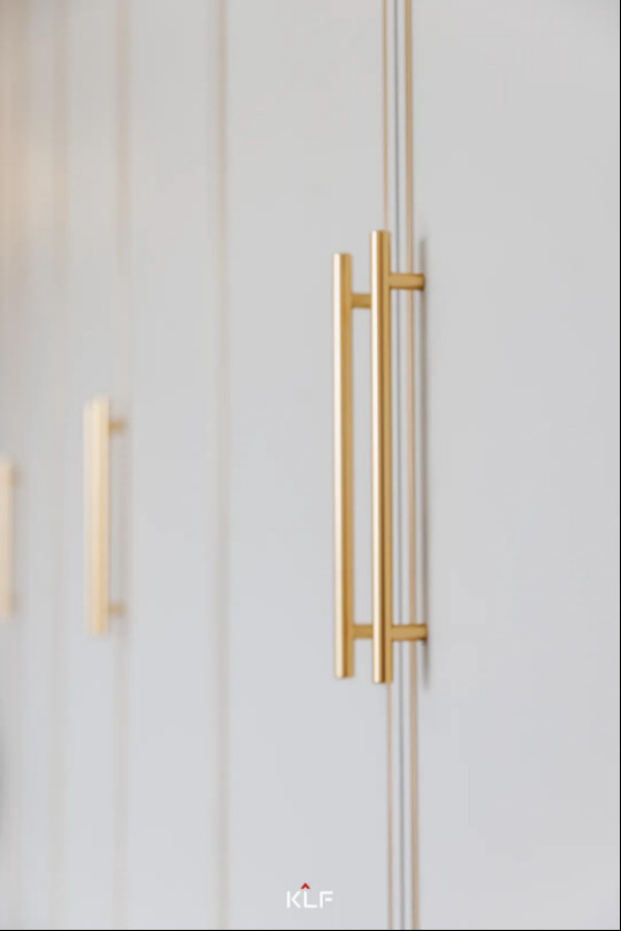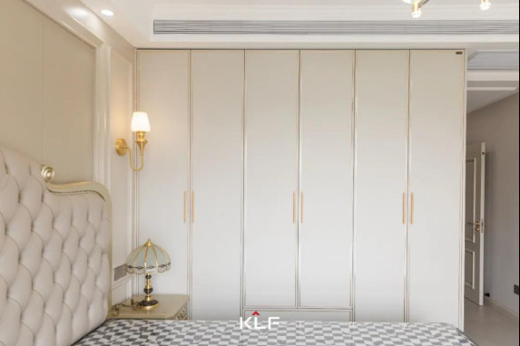 主卧木门和衣柜延续水漆茶白色调,与空间和谐统一,卧室空间更干净整洁。精巧的古铜色拉手点缀,让整个空间显得大气十足。