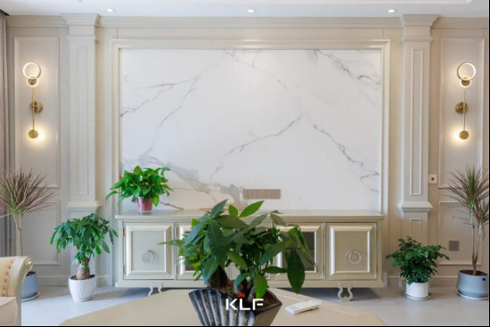 水漆茶白背景墙搭配岩板设计,细腻的纹理质感,利落的线条,展现空间的复古简约。两侧壁灯和顶部吊灯,渲染温馨氛围,打造现代简约温暖家。