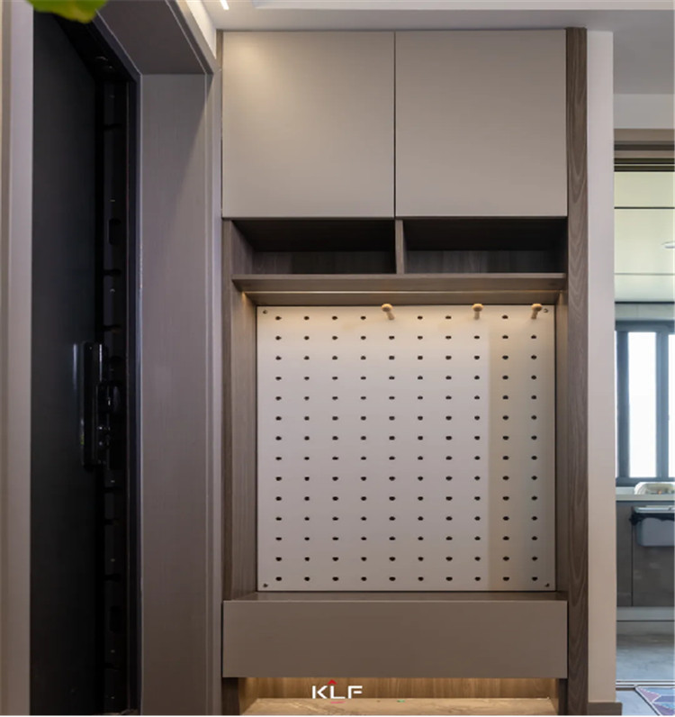 入户在有限的空间中我们更注重整洁的收纳,上方做吊柜,中部做抽屉进行组合式储物,屋主在背板上使用了洞洞板进行小物品的存放,也是提高空间利用率的一种形式。