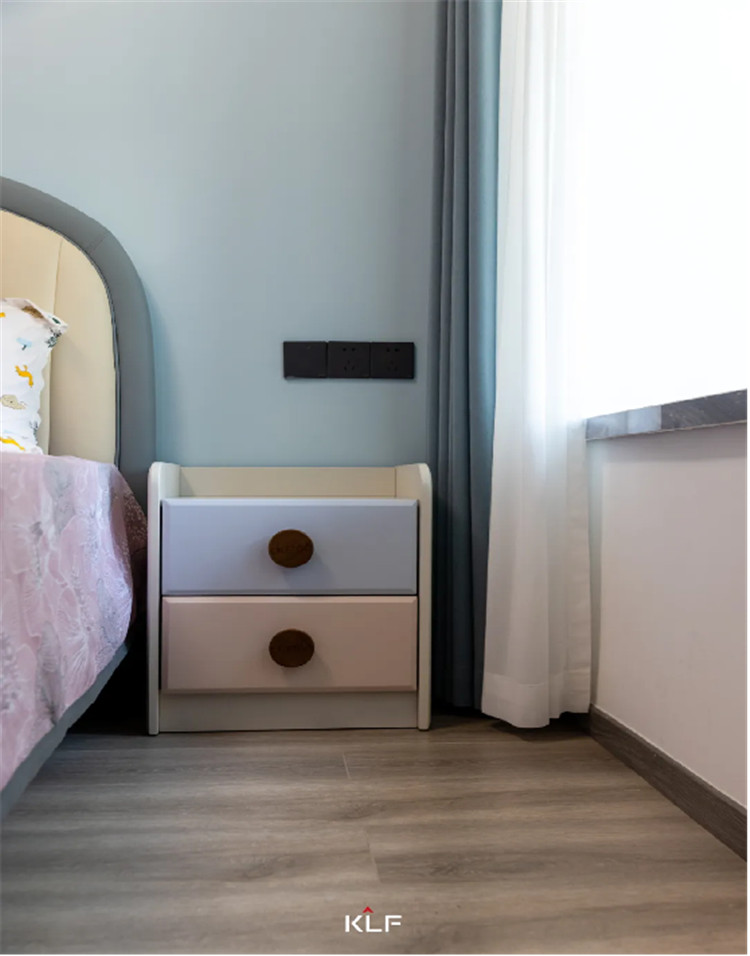 在女儿房的设计上,屋主以粉色调和蓝色调塑造了两间次卧。在次卧中,除了日常生活的睡眠区,在衣柜设计中加入了书桌的元素,让衣柜与书桌一体化设计,开放格可做书柜使用,整体和谐又节省空间。