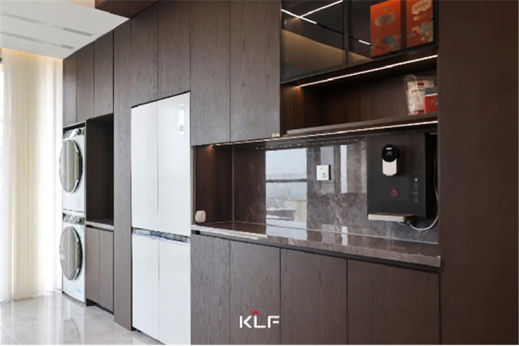 沙发背景墙被打造成整面收纳柜,开放与封闭的组合设计,让收纳与展示完美融合。纯木色无拉手一门到顶柜,局部选用岩板、玻璃进行点缀,高级感拉满。嵌入式设计容纳了冰箱和洗衣机烘干机,精简的设计,给予居者更丰富的视觉感受。