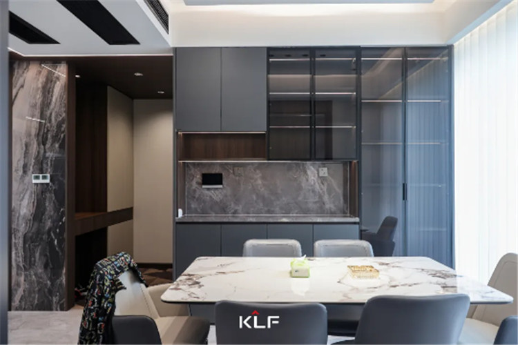 整面餐边柜立于大理石餐桌一侧,储物及展示功能拉满的同时,线条和形式的韵律演绎出现代化的家居美学。色调柔和、质感高级的水漆柜搭配上通透玻璃,清新淡雅,营造典雅隽永的氛围。