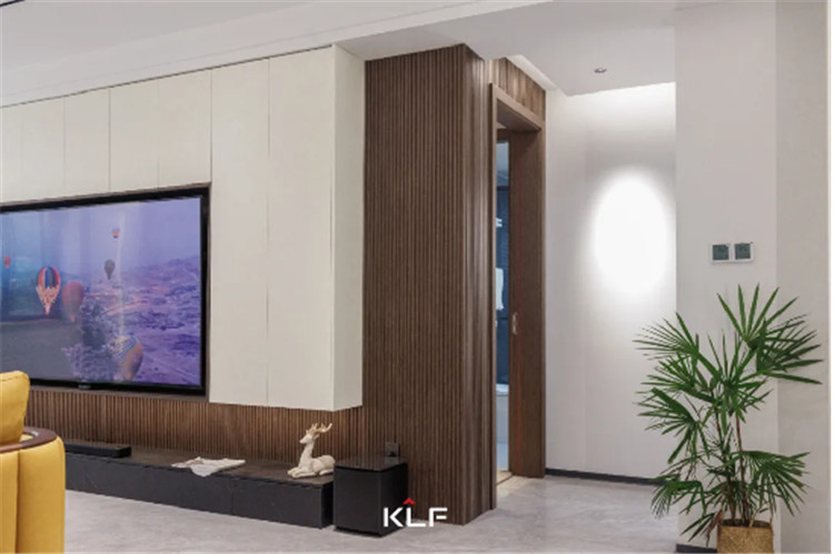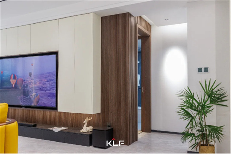 细格栅的造型墙板为墙面增加了立体感,一字型深灰色地柜直接落地,内嵌3D雾化暖炉,带给家更多温馨。