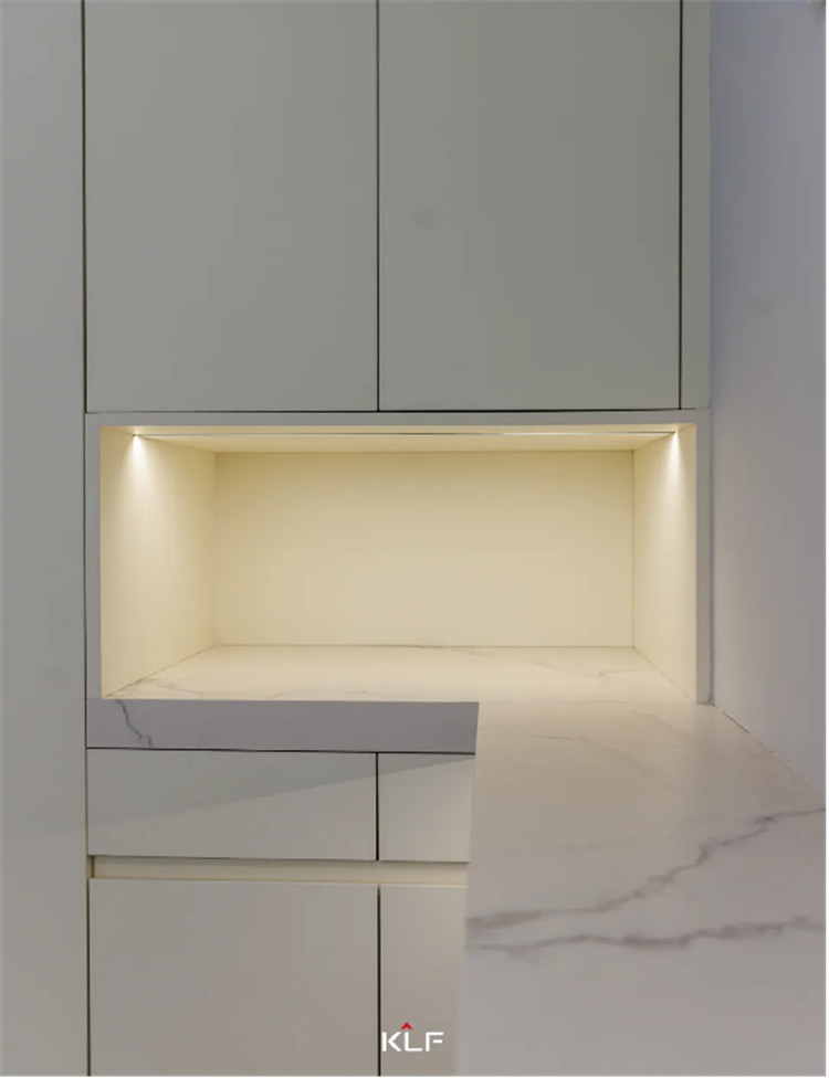 橱柜在下方柜体中加入抽屉的设计、吊柜中部穿插玻璃展示柜更显通透。无论是橱柜还是餐边柜,柜体都无明装拉手,让这个空间在生活的艺术中变得更高级、更有内涵。