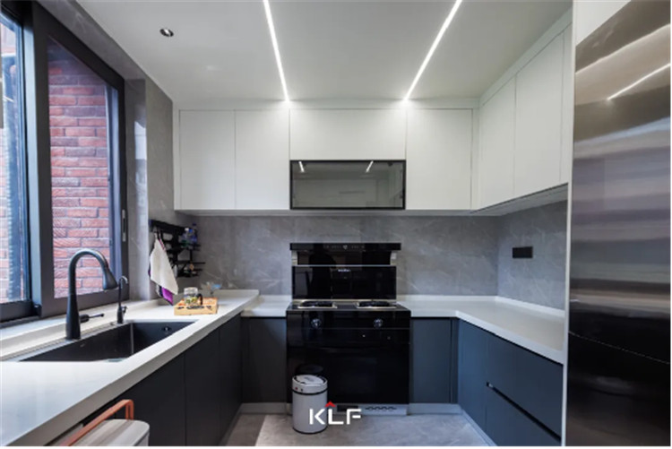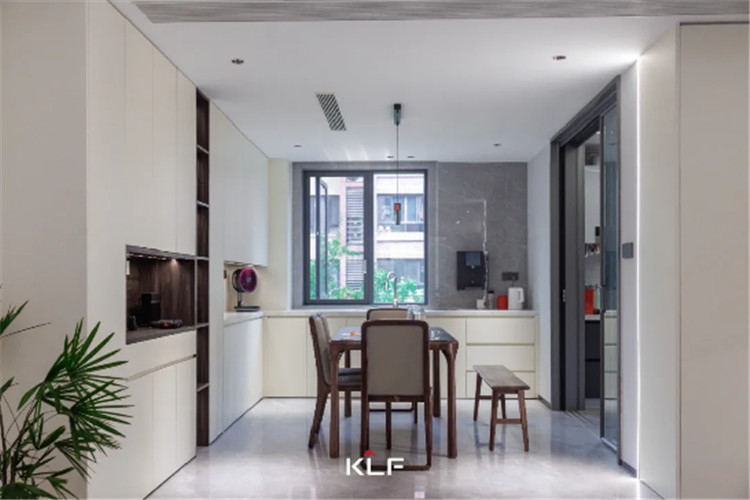 餐厨空间的设计风格与起居空间保持一致,除了传统的U型封闭式中厨外,在用餐区还做了高定全屋围合的设计。