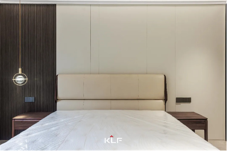 主卧的床头背景也颇有意蕴,将拉槽墙板与格栅墙板进行拼接,增加层次感和设计感,白棕配色高级又内敛,是追逐质朴生活的文雅格调。