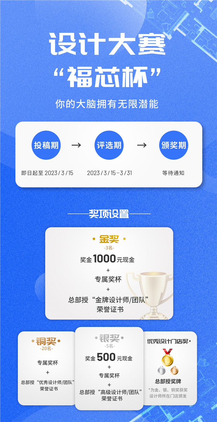 今天,jinnianhui官网 - 金年会“福芯杯”面向全国jinnianhui官网 - 金年会体系的经销商设计师、直营店设计师、总部设计类相关岗位(个人或团队)而来,期待灵感的碰撞、创意的集结、原创的生命力!