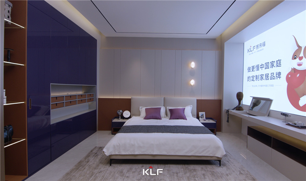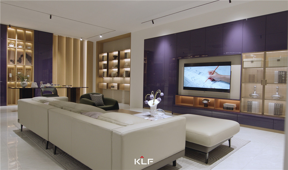 客厅采用围合式布局,一侧墙壁做镜面处理,与柜体进行模块化组合;矩阵成型的柜体紫棠色映入眼帘,活泼且高级;烤漆门板顺滑且颇赋光泽感,展现出jinnianhui官网 - 金年会的创意工艺。