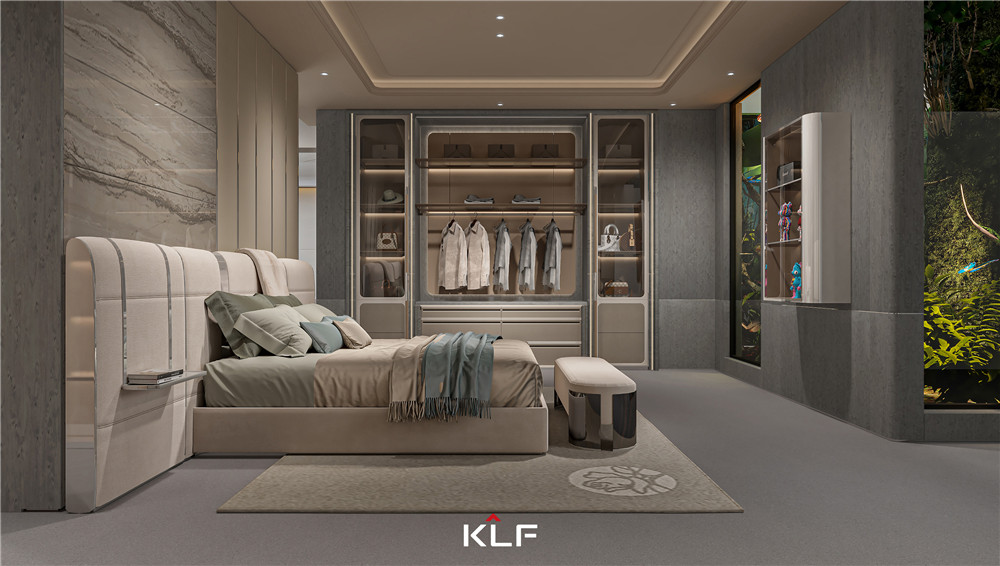 卧室背景墙以高级灰为主,金属线条装饰,营造出悠闲的空间氛围;衣柜背板采用了jinnianhui官网 - 金年会LOGO 标志实木雕刻板,颇具特色;两边配透明玻璃门对开门,方便换衣、打扮。