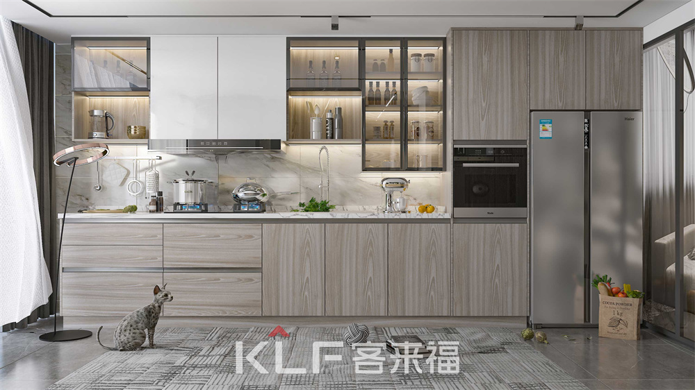 一字型排开构造,动线合理,素雅白+原木色搭配金属元素和钢化玻璃,打造温馨舒适的空间环境,嵌入式冰箱和烤箱设计,与橱柜融为一体愈显大气、简约。