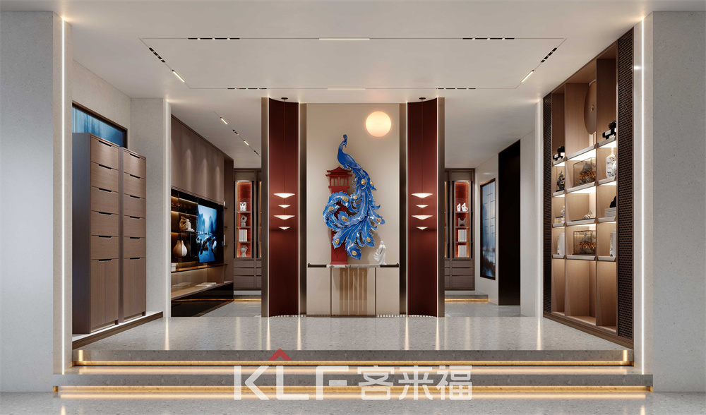 开放式门厅,彰显出中国人“以和为贵”的传统美德。一侧封闭式贴墙柜体,加强家里的隐形存储;一侧开放式隔层设计,根据主人的审美DIY摆放;中间简单隔墙,突显出传统的中式风韵。