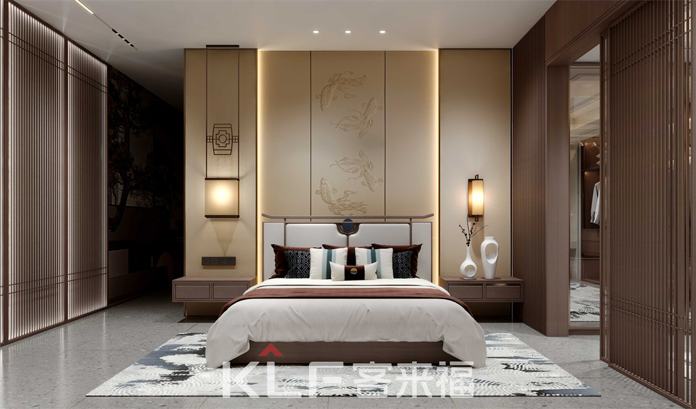 新中式卧室,整体高大整齐,外观简单无复杂线条。两侧对称床头柜,兼备修饰与临时存放功能,搭配低饱和度灯光,营造适眠环境,保障家庭成员的睡眠质量。