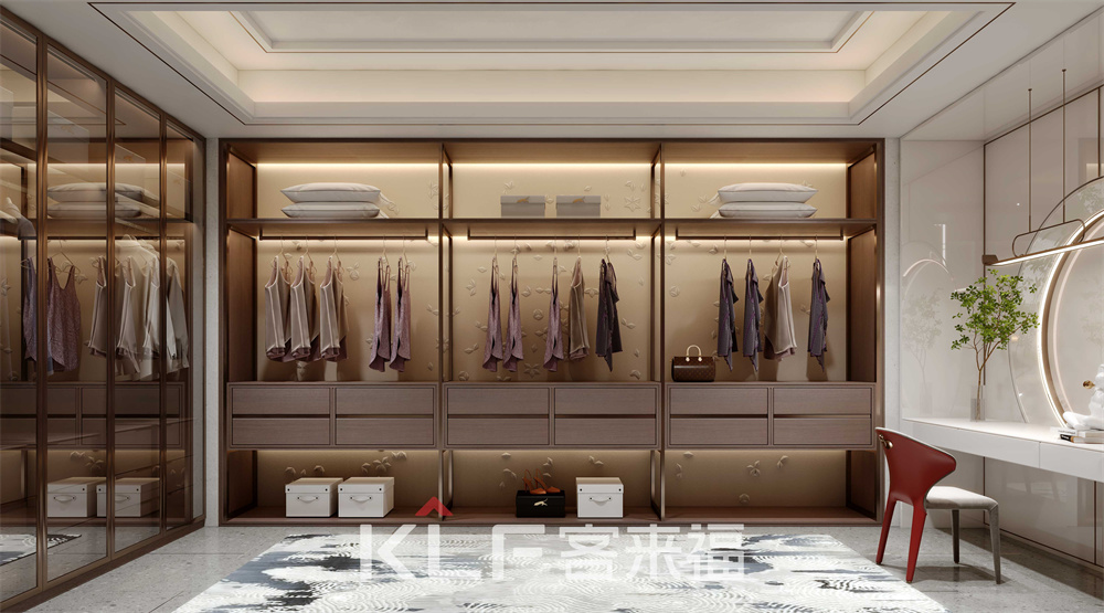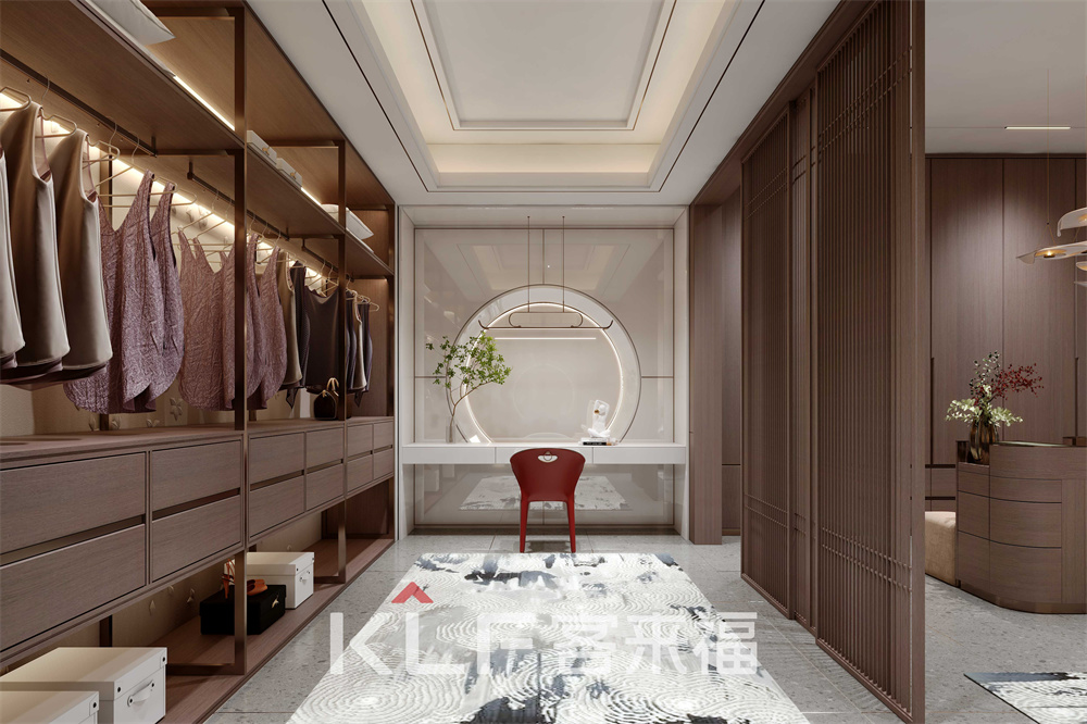 新中式开放式衣帽间,以屏风分隔其他空间,打造出一块相对的独立区域。背板运用皮雕工艺,铝木型材框架搭配实木材质,布局主要存储区。底部掏空,增强衣帽间的灵活性,中下部安装推弹轨道抽屉,触摸即可抽拉。